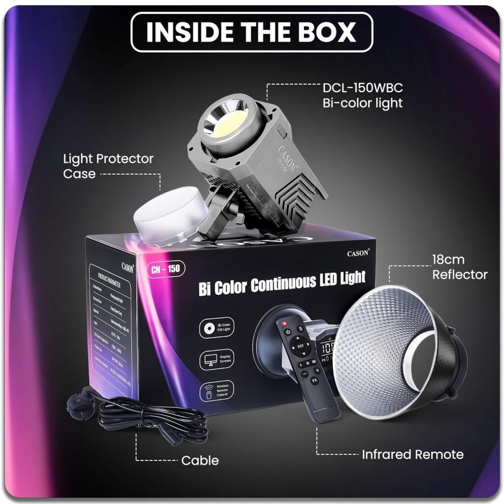 Cason 150W Bi-Color LED Studio Light – Adjustable 2700K-6500K Video Lighting Kit with Remote, Reflector & Display Screen for Professional Videography